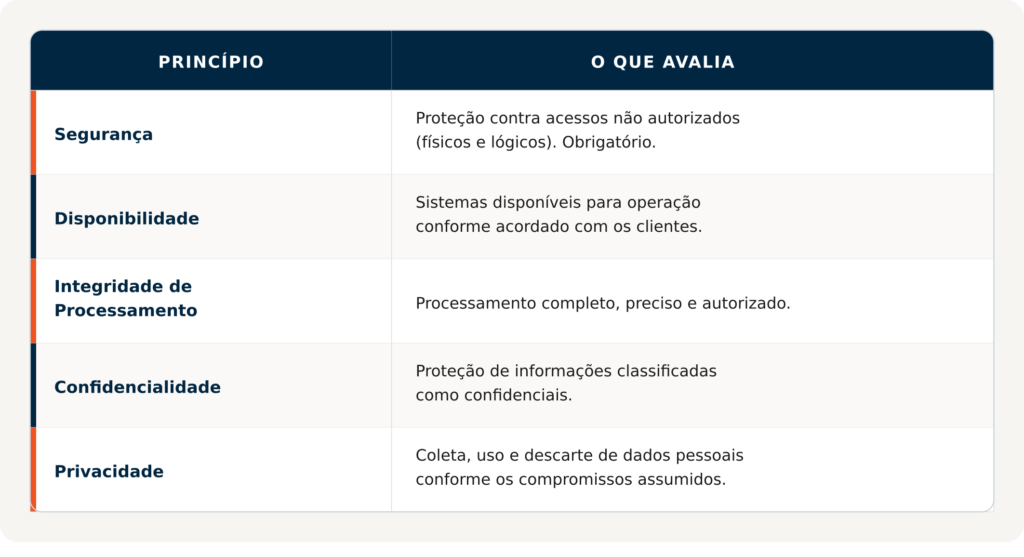 O SOC 2 é estruturado em torno de cinco critérios conhecidos como Trust Services Criteria:
